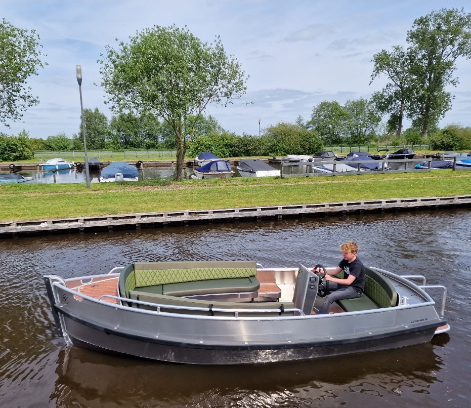 The Sloep Deluxe is equipped with a backrest and luxurious cushion set so that you can sit comfortably. The boat is steered with a steering wheel like in a car.